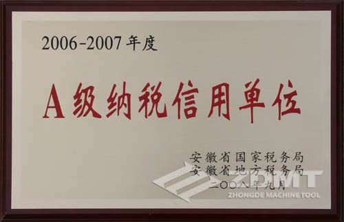 近日,安徽省國家稅務(wù)局、地方稅務(wù)局聯(lián)合表彰了2006-2007年度納稅信用等級A級納稅人,中德機(jī)床也再次被授予了“A級納稅信用單位”的證書。