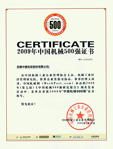 由中國機械工業(yè)企業(yè)管理協(xié)會主辦,機械工業(yè)經(jīng)濟管理研究院、世界企業(yè)實驗室協(xié)辦,世界經(jīng)理人周刊、中國機械網(wǎng)承辦的2009年(第七屆)《中國機械500強研究報告》調(diào)查活動公布,中德機床榮獲2009年“中國機械500強”。